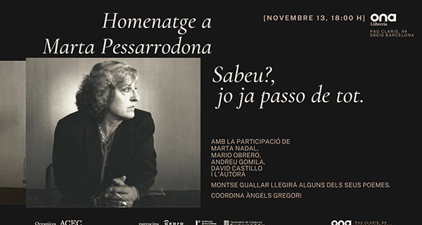 Sabeu? Jo ja passo de tot. Aquest és el títol de l’acte d’homenatge a Marta Pessarrodona, poetessa, narradora i crítica literària, que tindrà lloc a la llibreria Ona dijous, 13 de novembre, a partir de les 18 h. L’organitza l’Associació Col·legial d’Escriptors de Catalunya (ACEC), amb el patrocini de CEDRO, la Institució de les Lletres Catalanes i el Departament de Cultura de la Generalitat de Catalunya, i ho coordina Àngels Gregori.